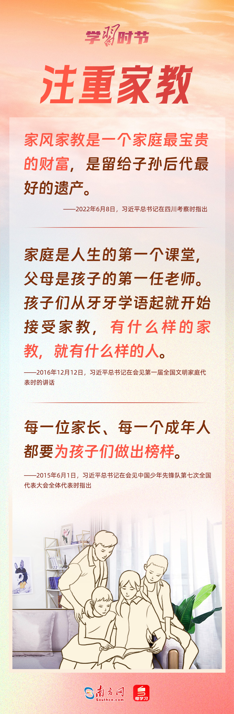 5月15日是國際家庭日。家庭是社會的細胞,是國家發(fā)展、民族進步、社會和諧的重要基點。習近平總書記心中始終牽掛著千家萬戶,高度重視家庭、家教和家風建設,強調(diào)不論時代發(fā)生多大變化,不論生活格局發(fā)生多大變化,我們都要重視家庭建設,注重家庭、注重家教、注重家風。家庭和睦、家教良好、家風端正,子女才能健康成長,社會才能健康發(fā)展。
