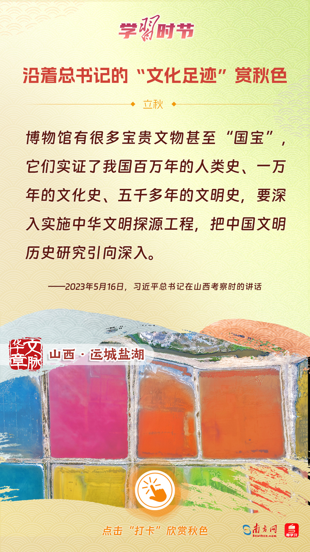 立秋之際,讓我們一起跟隨習(xí)近平總書記的足跡,學(xué)習(xí)習(xí)近平總書記關(guān)于文化建設(shè)的重要論述,感受全國各地文化地標(biāo)古跡的秋意,汲取文化自信的強(qiáng)大力量。