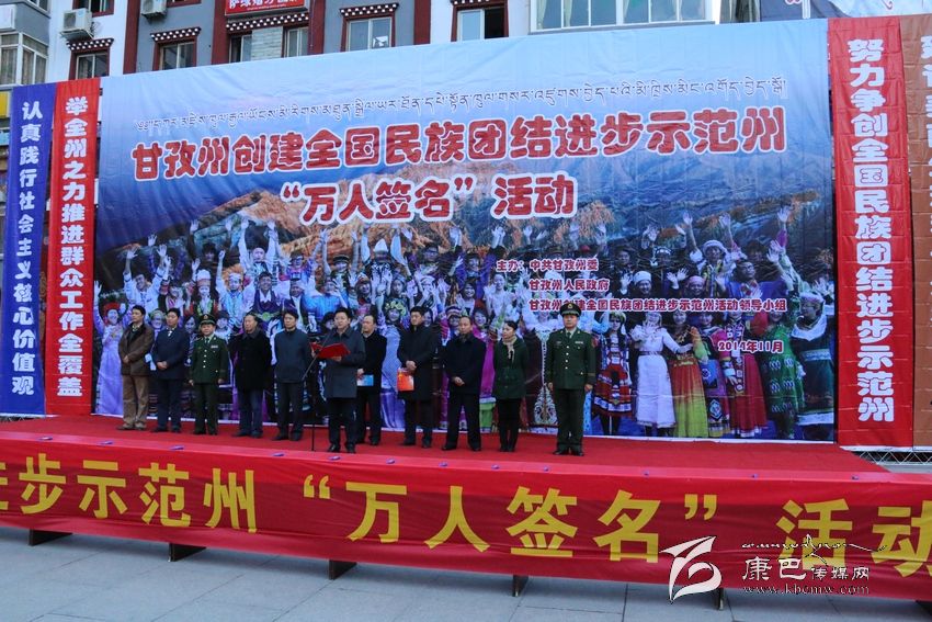 州人大常委會(huì)副主任李致民宣布創(chuàng)建全國(guó)民族團(tuán)結(jié)進(jìn)步示范州“萬人簽名”活動(dòng)正式開始后,州領(lǐng)導(dǎo)汪洋、李致民、楊國(guó)元、范文華、蔣秀英、楊學(xué)康以及甘孜軍分區(qū)、駐州武警部隊(duì)領(lǐng)導(dǎo)同州級(jí)機(jī)關(guān)、志愿者、個(gè)體工商戶、學(xué)生、駐軍、政法干警、康定縣黨政機(jī)關(guān)干部代表近千人,陸續(xù)到“萬人簽名”條幅上簽下了自己的姓名。