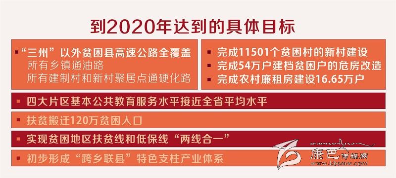 方案提出,到2020年“三州”以外貧困縣高速公路全覆蓋,所有鄉(xiāng)鎮(zhèn)通油路、所有建制村和新村聚居點通硬化路;完成11501個貧困村的新村建設,全面完成54萬戶建檔貧困戶的危房改造,完成農(nóng)村廉租房建設16.65萬戶;四大片區(qū)基本公共教育服務水平接近全省平均水平;扶貧搬遷120萬貧困人口;實現(xiàn)貧困地區(qū)扶貧線和低保線“兩線合一”;初步形成“跨鄉(xiāng)聯(lián)縣”特色支柱產(chǎn)業(yè)體系等多項具體目標。最終,確保省委提出的497.65萬農(nóng)村貧困人口全部脫貧、11501個貧困村和88個貧困縣全部“摘帽”,貧困縣農(nóng)民人均純收入比2010年翻一番以上,實現(xiàn)基本公共服務均等化、社會保障全覆蓋的目標全面實現(xiàn)。