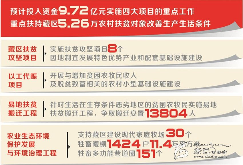 答:比如藏區(qū)扶貧攻堅(jiān)項(xiàng)目,從實(shí)施內(nèi)容來看,今年在阿壩州、甘孜州、涼山州木里縣實(shí)施扶貧攻堅(jiān)項(xiàng)目8個(gè),其中阿壩州3個(gè)、甘孜州4個(gè)、涼山州木里縣1個(gè),預(yù)計(jì)投入中央財(cái)政專項(xiàng)扶貧資金4000萬元,表面上延續(xù)了去年的工作,但今年實(shí)施項(xiàng)目將突出兩大要求,一是項(xiàng)目要瞄準(zhǔn)今年有計(jì)劃摘帽的貧困村、計(jì)劃脫貧的貧困戶,集中力量解決突出問題。二是項(xiàng)目資金要到村入戶,因地制宜發(fā)展特色優(yōu)勢產(chǎn)業(yè)和配套基礎(chǔ)設(shè)施建設(shè),確保精準(zhǔn)扶貧。