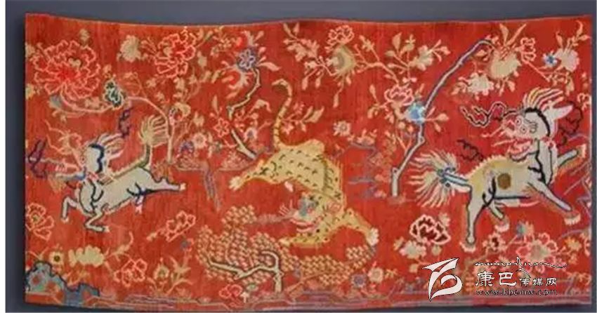 織制有麒麟、老虎和獅子的彩色掛毯寓意著福、祿、壽,是從前達官顯貴們重要家裝飾品之一。此掛毯上的動物與花朵造型古樸,雖然已歷經歲月,然而色澤依舊鮮艷如初。