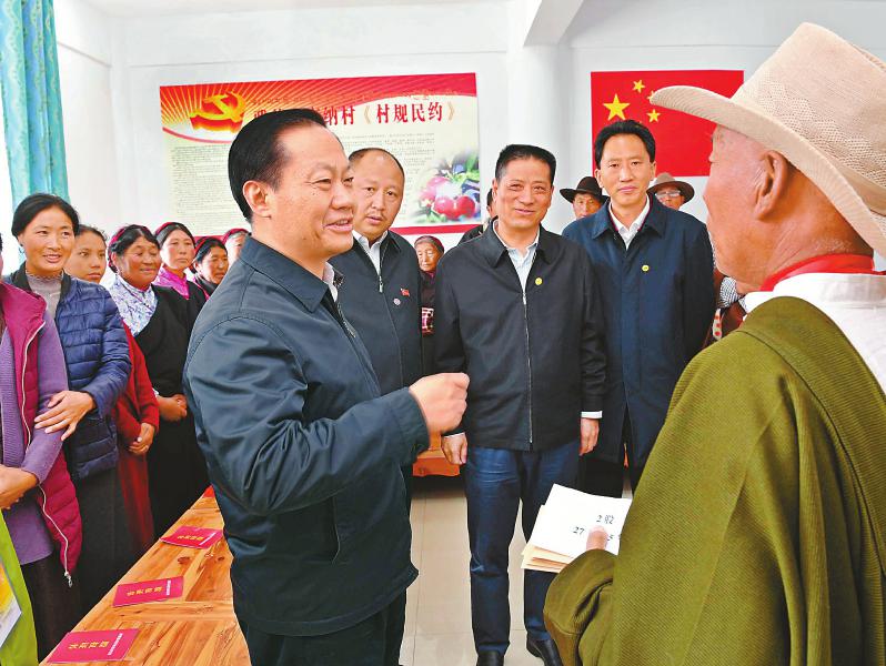 在村民澤翁家中,彭清華細(xì)致察看整修后的旅游民宿,了解房屋結(jié)構(gòu)功能、抗震設(shè)防標(biāo)準(zhǔn)和修建費(fèi)用等,與一家人拉家常、聊增收,鼓勵(lì)他們?cè)俳釉賲枺讶兆釉竭^(guò)越好。雅德鄉(xiāng)交納村平均海拔3300米,是典型的高原藏區(qū)貧困村。彭清華沿著崎嶇的山路步行來(lái)到貧困戶亞瑪忠登和根呷家中,與他們圍坐在一起,共同分析致貧原因和脫貧進(jìn)展,詳細(xì)了解各項(xiàng)幫扶措施落實(shí)情況,為他們脫貧增收鼓勁支招。在交納村村委會(huì)辦公室,彭清華與在這里參加合作社入股分紅活動(dòng)的村民們親切交談。他對(duì)在場(chǎng)的村干部和鄉(xiāng)親們說(shuō),習(xí)近平總書(shū)記、黨中央十分牽掛藏區(qū)群眾,對(duì)扎實(shí)做好藏區(qū)經(jīng)濟(jì)發(fā)展、民生改善和社會(huì)和諧穩(wěn)定特別是脫貧攻堅(jiān)等方面工作作出一系列重要指示、提出明確要求。我們要認(rèn)真學(xué)習(xí)領(lǐng)會(huì)、堅(jiān)決貫徹落實(shí)。希望鄉(xiāng)親們始終銘記習(xí)近平總書(shū)記的深切關(guān)懷,進(jìn)一步堅(jiān)定脫貧信心,大力發(fā)展生產(chǎn),積極學(xué)習(xí)技術(shù),尤其要重視孩子們的培養(yǎng)教育,讓適齡少年兒童都能接受義務(wù)教育,堅(jiān)決阻斷貧困代際傳遞。要充分發(fā)揮群眾的積極性和主動(dòng)性,引導(dǎo)村民依靠自己的辛勤勞動(dòng)拔窮根、摘窮帽,早日脫貧致富奔小康。