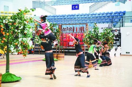 雅安市代表團教練李鏡文告訴記者,《石炯諧博》表演項目依托當地彝家民俗,在黃果柑豐收的季節(jié),石棉縣彝族小伙、姑娘們在果林里采摘黃果柑時所產生的勞動趣味競技活動的演繹,反映了少數民族地區(qū)經濟發(fā)展、社會繁榮穩(wěn)定、各族人民安居樂業(yè)的生活和精神風貌。