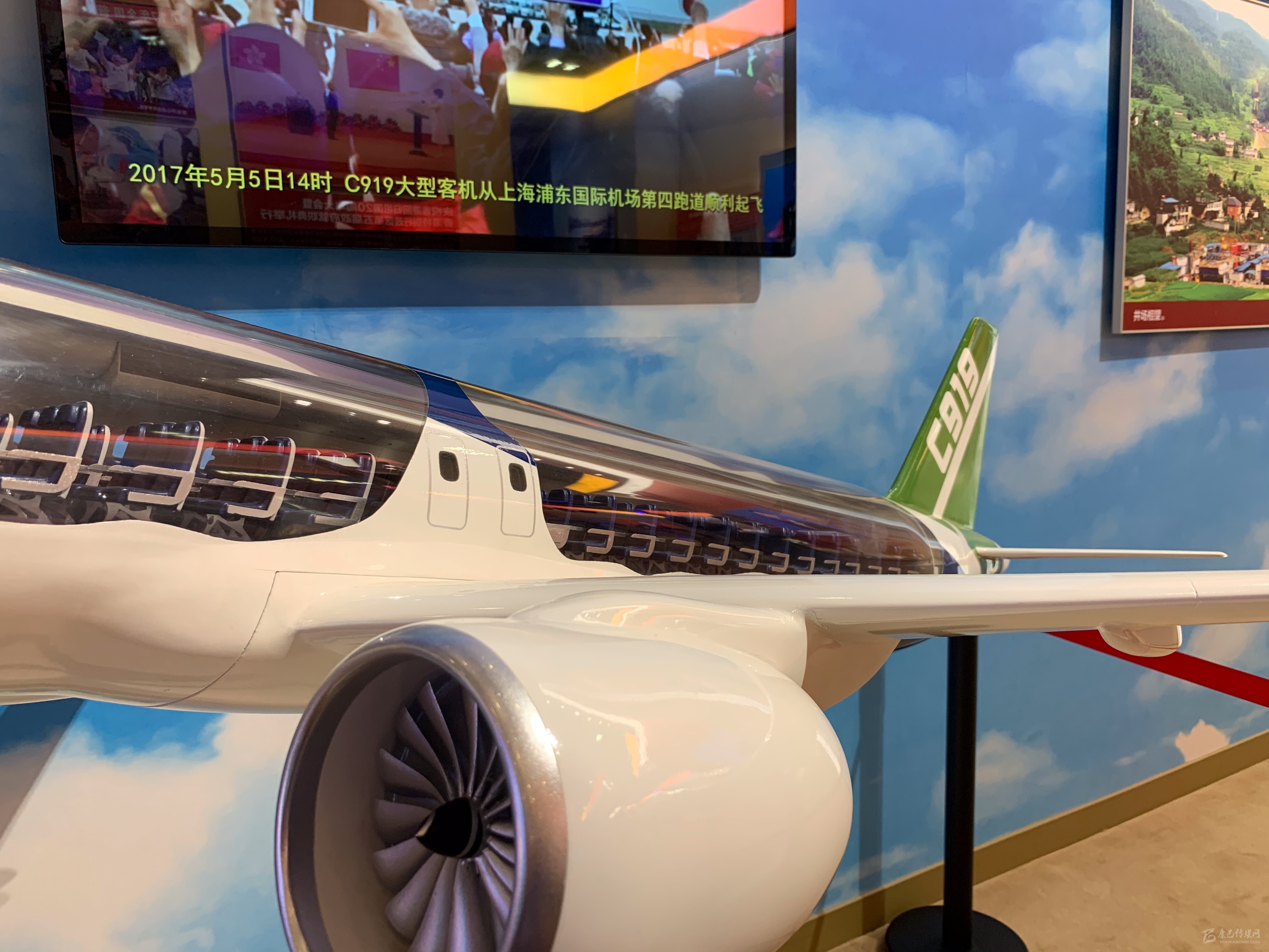 在2017年展區(qū),C919大飛機(jī)模型,配合解說圖片以及總裝下線當(dāng)日的視頻展出。