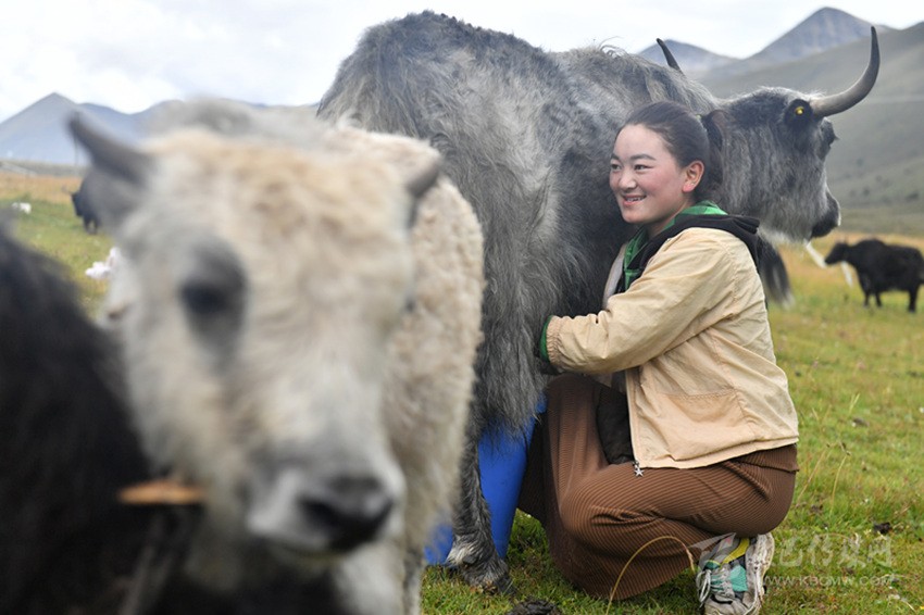 康定市俄達(dá)門巴村的一位姑娘在給牦牛擠奶。 新華社 發(fā)