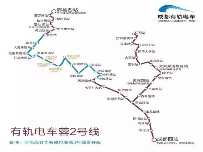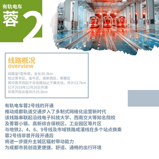 有軌電車蓉2號線工程線路呈Y型布局,線路經(jīng)過青羊區(qū)、金牛區(qū)、高新西區(qū)、郫都區(qū),線路全長39.3km。其中首開段起于合信路站,止于晨光站共計13.7km,已于2018年12月26日開通,非首開段長度共計25.6km。