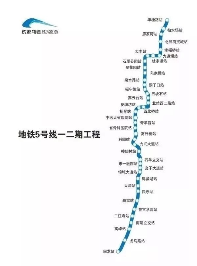 5號線一二期線路全長49.02km,設(shè)車站41座,其中地下站36座,高架站5座,換乘站4座(5號線開通時)。其中,一期工程由華桂路向南引出至騎龍站,二期工程由騎龍站向南引出至回龍站。