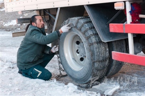 其美多吉在途中幫助社會(huì)車(chē)輛安裝防滑鏈(資料照片)。其美多吉是中國(guó)郵政甘孜縣分公司郵運(yùn)駕駛組的一名郵車(chē)司機(jī),往返在甘孜縣與德格縣之間。這段路程是四川省甘孜州綿延5866公里、平均海拔超過(guò)3500米的雪線郵路最危險(xiǎn)的一段。新華社發(fā)(周兵 攝)