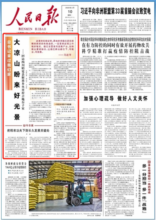 2月10日出版的《人民日?qǐng)?bào)》,在頭版刊登了《大涼山盼來(lái)好光景》的報(bào)道,聚焦四川昭覺(jué)縣解放鄉(xiāng)火普村易地扶貧搬遷,村民不等不靠不要,積極發(fā)展種養(yǎng)業(yè),彝家兒女奔向充滿希望的新生活。