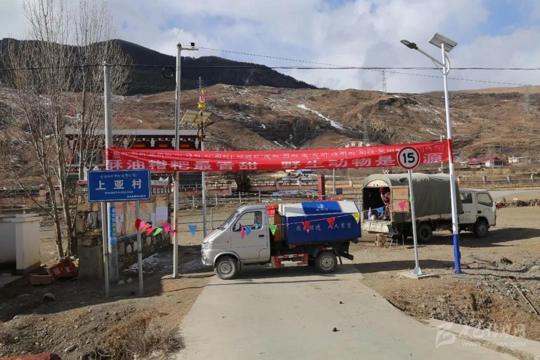 “不準(zhǔn)進(jìn)哈,離我遠(yuǎn)點(diǎn)。”2月13日,記者來(lái)到道孚縣格西鄉(xiāng)上亞村口,一個(gè)垃圾車(chē)橫著堵住進(jìn)村道路,一幅“酥油糌粑最香甜,野生動(dòng)物是病源”的橫幅醒目地牽一根電桿和路燈柱上,一個(gè)中年藏族婦女遠(yuǎn)遠(yuǎn)地打著招呼。