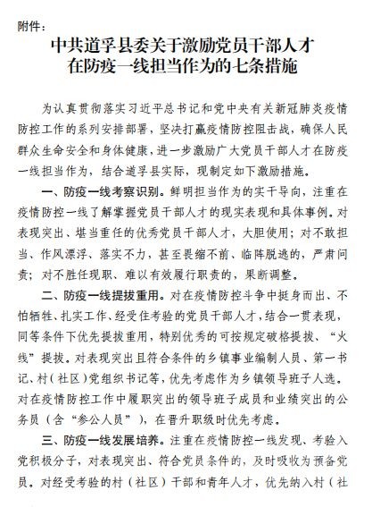 疾風知勁草,板蕩識誠臣。自新型冠狀病毒肺炎疫情防控阻擊戰(zhàn)打響以來,道孚縣各級黨組織和黨員、干部主動擔當作為,積極投入疫情防控最前線,為有力防控疫情蔓延作出重要貢獻。近日,道孚縣委印發(fā)《中共道孚縣委關于激勵黨員干部人才在防疫一線擔當作為的七條措施》,關心關愛、激勵引導廣大黨員、干部、各類人才在疫情防控一線履職盡責、擔當作為、安心戰(zhàn)斗。