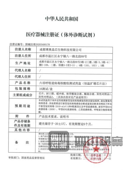 2月22日,國家藥品監(jiān)督管理局應急審批通過3個新型冠狀病毒檢測產(chǎn)品,其中之一的“六項呼吸道病毒核酸檢測試劑盒”就是鐘院士提到的試劑,而它則是由位于成都溫江的企業(yè)——博奧生物聯(lián)合清華大學、四川大學華西醫(yī)院共同設計開發(fā)的。這款產(chǎn)品正在迅速應用到疫情防控前線,為一線提供快速、精準、有效診斷。