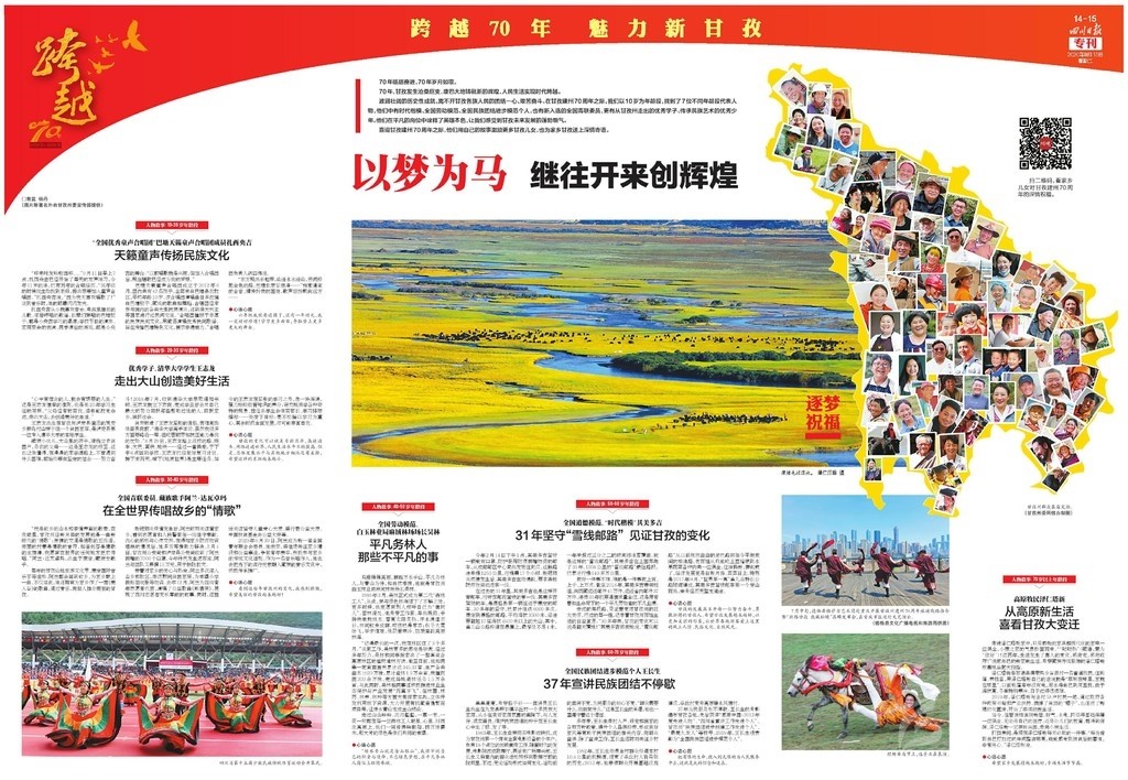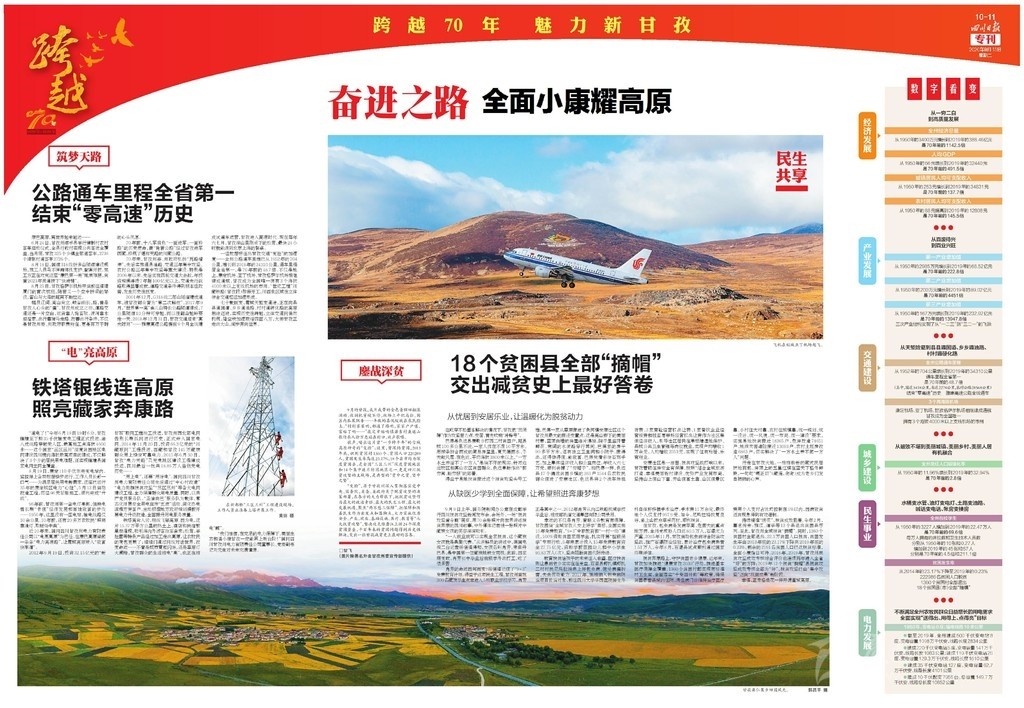 開篇連版以手繪甘孜建州70周年10件大事記鋪底,部分金山、碉樓等民族元素做點(diǎn)綴。版面上有州委州政府的署名文章,還有川報首席記者所寫《光輝歲月 砥礪奮進(jìn)》70年綜述,并鏈接二維碼,可通過手機(jī)掃碼看甘孜70年變遷。