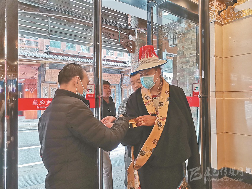 色達(dá)縣演出隊(duì)入住邦金麥朵酒店。每天,酒店安保人員多扎準(zhǔn)時(shí)出現(xiàn)在門口,提醒演職人員測(cè)量體溫、佩戴口罩。“我是酒店的第一關(guān)卡,拉姆是第二關(guān),我倆相互配合,表演節(jié)目的客人住得放心,演出的節(jié)目才會(huì)更加精彩?!蹦弥w溫槍,多扎一臉自豪地說(shuō)。