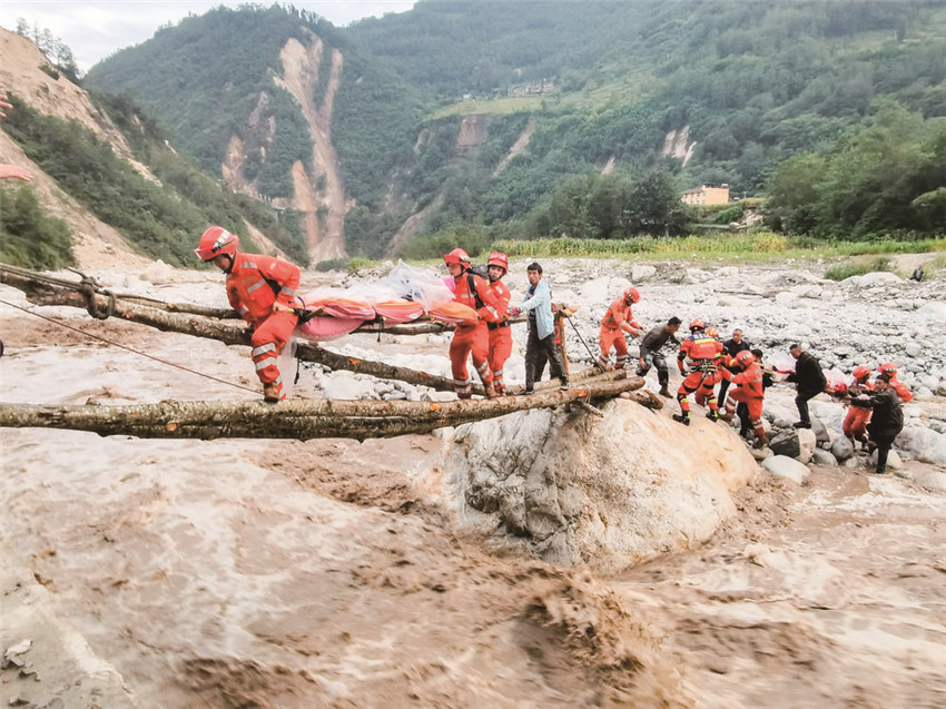 道路中斷、信號(hào)中斷,河流上漲、橋梁垮塌?!皼]有橋,我們的雙手就是橋?!标P(guān)鍵時(shí)刻,四川省森林消防總隊(duì)甘孜支隊(duì)消防員兵分兩路實(shí)施營救。一路“繩為引、步為尺”先期過河救治傷員,一路就地取材急流上用樹干搭起“生命通道”,自制擔(dān)架將傷員一一運(yùn)送過河;截至5日晚23時(shí)40分,甘孜森林消防隊(duì)員們翻山越嶺往返近7小時(shí),安全轉(zhuǎn)運(yùn)重傷員24人、近200名群眾,徒步行程18公里。
