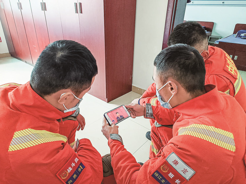 康定森林消防中隊(duì)消防員楊江龍和隊(duì)友在手機(jī)上收看黨的二十大開(kāi)幕會(huì)。