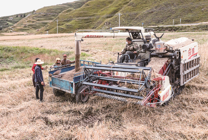 收割機(jī)正在收割青稞。 本網(wǎng)資料庫圖