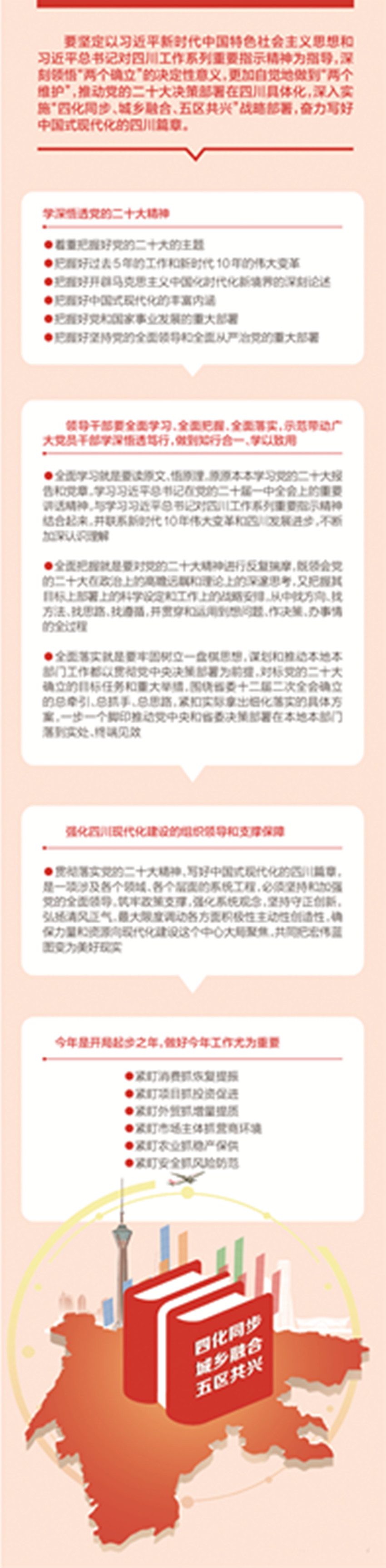 會議指出,今年是貫徹落實(shí)黨的二十大精神的開局之年,做好各項(xiàng)工作意義重大、十分重要。新春伊始,省委以“開春第一課”的形式舉辦了學(xué)習(xí)貫徹黨的二十大精神讀書班,深刻闡述了四川現(xiàn)代化建設(shè)的實(shí)踐問題,明確了推動“四化同步、城鄉(xiāng)融合、五區(qū)共興”重大戰(zhàn)略部署的實(shí)踐要求,對當(dāng)前經(jīng)濟(jì)發(fā)展工作進(jìn)行再強(qiáng)調(diào)再安排,為我們學(xué)習(xí)宣傳貫徹黨的二十大精神、推動甘孜經(jīng)濟(jì)社會高質(zhì)量發(fā)展指明了方向。各級領(lǐng)導(dǎo)干部要切實(shí)把思想和行動統(tǒng)一到中央、省委決策部署上來,收住心、定住氣、穩(wěn)住神,敢為敢闖、苦干實(shí)干,確保一季度起好步開好局,為全面完成年度經(jīng)濟(jì)社會發(fā)展預(yù)期目標(biāo)任務(wù)打下堅(jiān)實(shí)基礎(chǔ)。