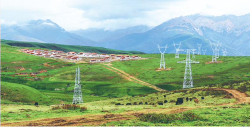 六月高原,繁花似錦,一座座青山延綿起伏,一基基鐵塔聳立山巔,一根根銀線連接其間,將圣潔甘孜生產(chǎn)的綠色電能脈脈傳送。