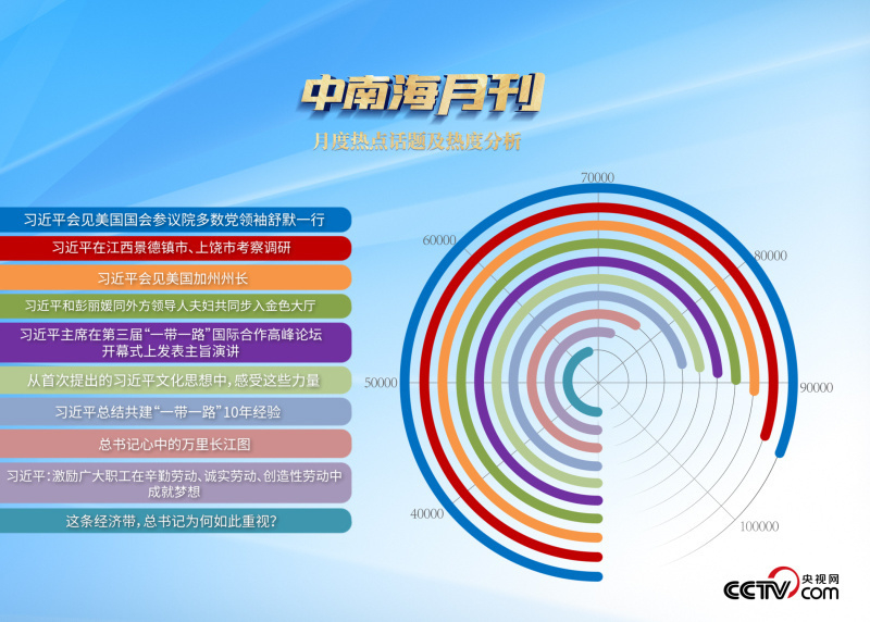 央視網(wǎng)“智聞”系統(tǒng)提取分析10月全網(wǎng)時政新聞熱點顯示,“習近平主席會見美國國會參議院多數(shù)黨領袖舒默一行”“習近平會見美國加州州長”“習近平主持召開進一步推動長江經(jīng)濟帶高質量發(fā)展座談會”等話題最受網(wǎng)民關注。