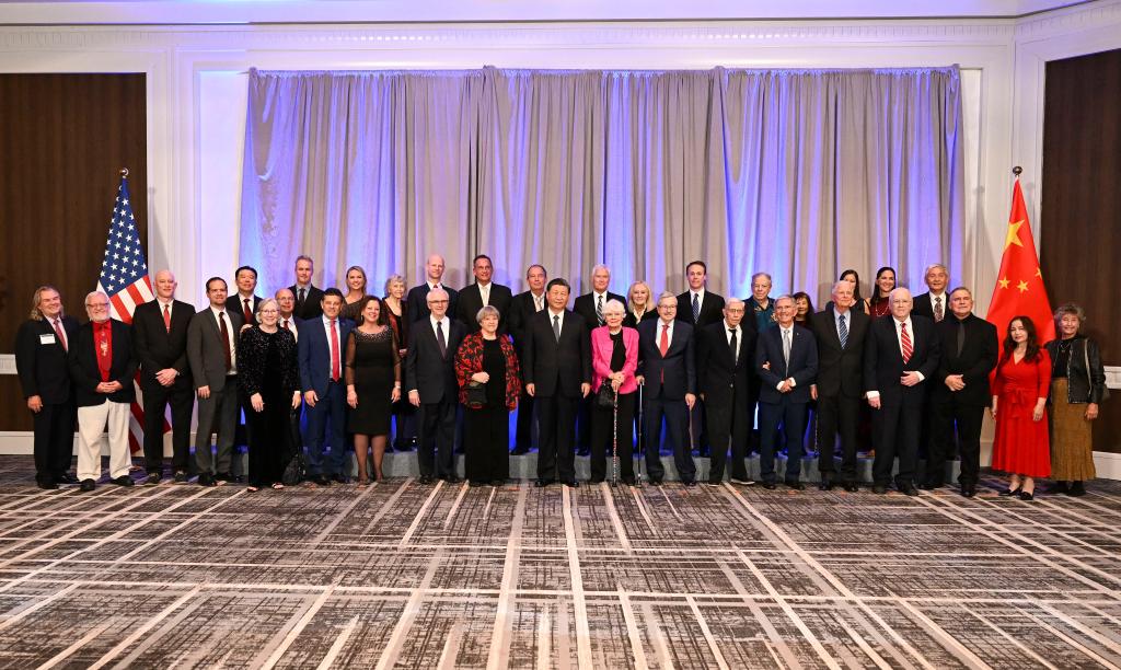 當(dāng)?shù)貢r間11月15日晚,國家主席習(xí)近平在美國舊金山出席美國友好團(tuán)體聯(lián)合舉行的歡迎宴會。這是宴會開始前,習(xí)近平會見飛虎隊(duì)和史迪威將軍后人、鼓嶺、艾奧瓦州、華盛頓州等方面友好人士代表,同他們親切交談并合影留念。