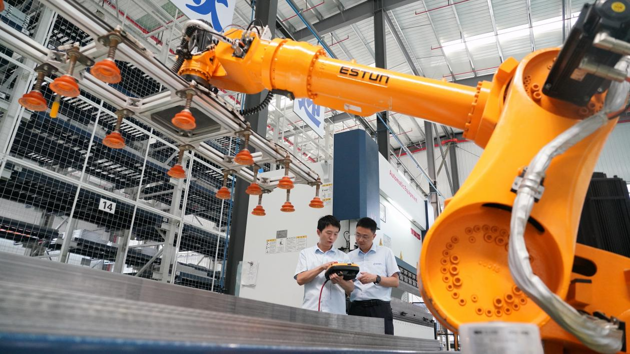 △2023年8月26日,在武漢光谷的一家長江電氣企業(yè)智能車間,工作人員正在操作智能機(jī)械臂。