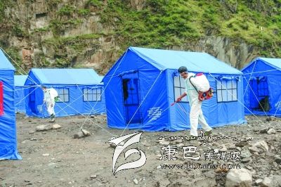 衛(wèi)生防疫人員對安置點(diǎn)進(jìn)行消毒。