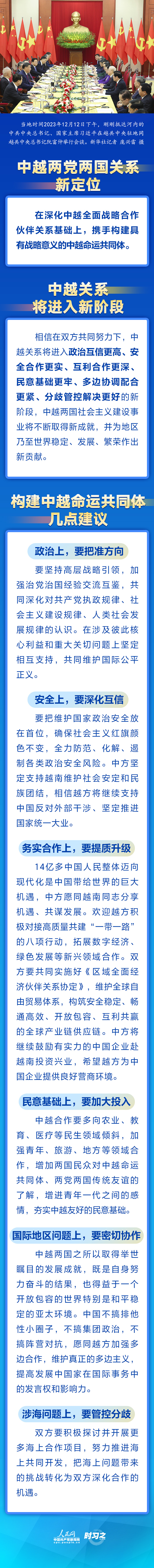 當(dāng)?shù)貢r(shí)間2023年12月12日下午,剛剛抵達(dá)河內(nèi)的中共中央總書記、國(guó)家主席習(xí)近平在越共中央駐地同越共中央總書記阮富仲舉行會(huì)談。雙方宣布中越兩黨兩國(guó)關(guān)系新定位,在深化中越全面戰(zhàn)略合作伙伴關(guān)系基礎(chǔ)上,攜手構(gòu)建具有戰(zhàn)略意義的中越命運(yùn)共同體。