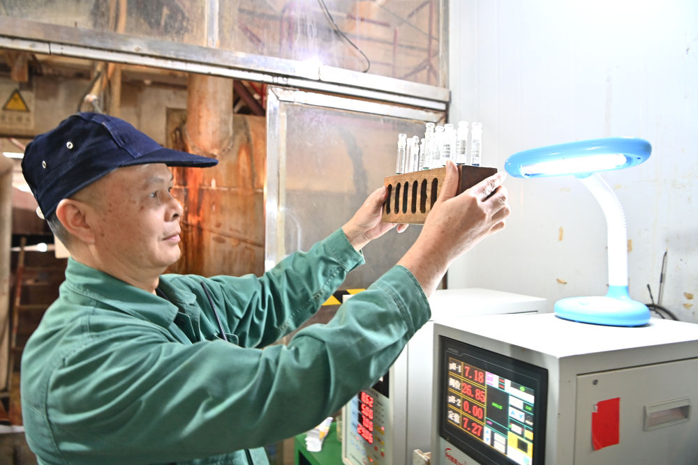 12月12日,廣西來賓小平陽湘桂制糖有限公司的工作人員在檢測糖漿樣品。