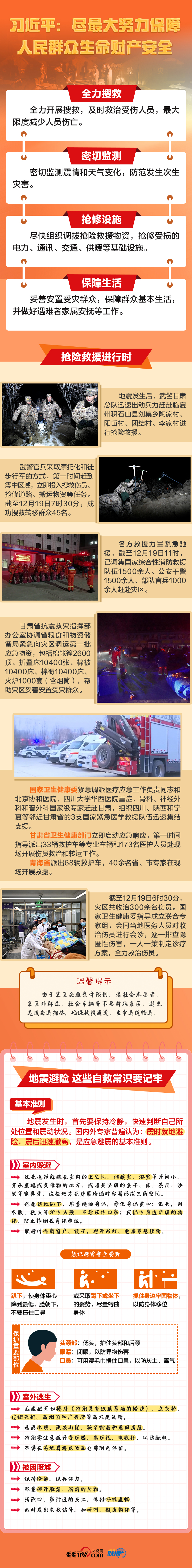 貫徹落實(shí)習(xí)近平總書記重要指示,各方力量火速集結(jié),全力以赴排查搜救、救治傷員,打通救援生命通道,盡力安置受災(zāi)群眾,搶修受災(zāi)基礎(chǔ)設(shè)施,嚴(yán)防余震、低溫等次生災(zāi)害……抗震救災(zāi)各項(xiàng)工作緊張有序進(jìn)行。