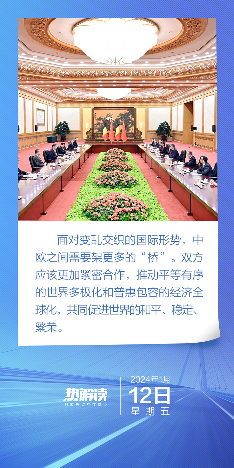 新年伊始,國(guó)際形勢(shì)變亂交織。具有戰(zhàn)略意義和世界影響的中歐關(guān)系,關(guān)乎世界和平、穩(wěn)定、繁榮。中歐應(yīng)該更加緊密合作,共同架設(shè)更多的“橋”,為世界提供更多穩(wěn)定性,為發(fā)展提供更多推動(dòng)力。