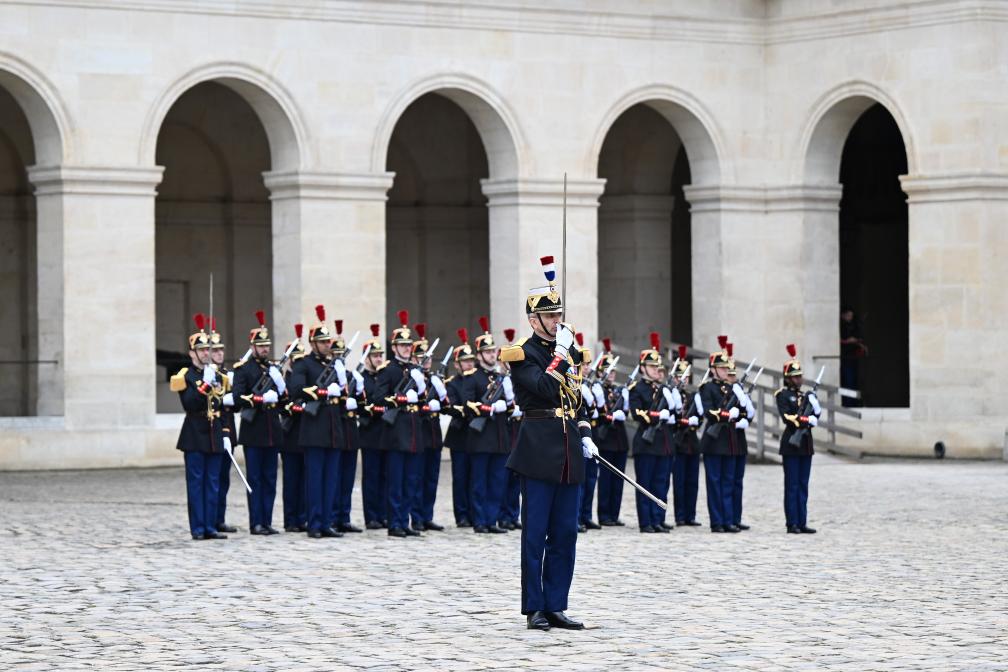 ??當(dāng)天下午,習(xí)近平在巴黎出席馬克龍舉行的隆重盛大歡迎儀式。兩國元首檢閱法蘭西共和國衛(wèi)隊和陸??杖妰x仗隊,并觀看分列式。