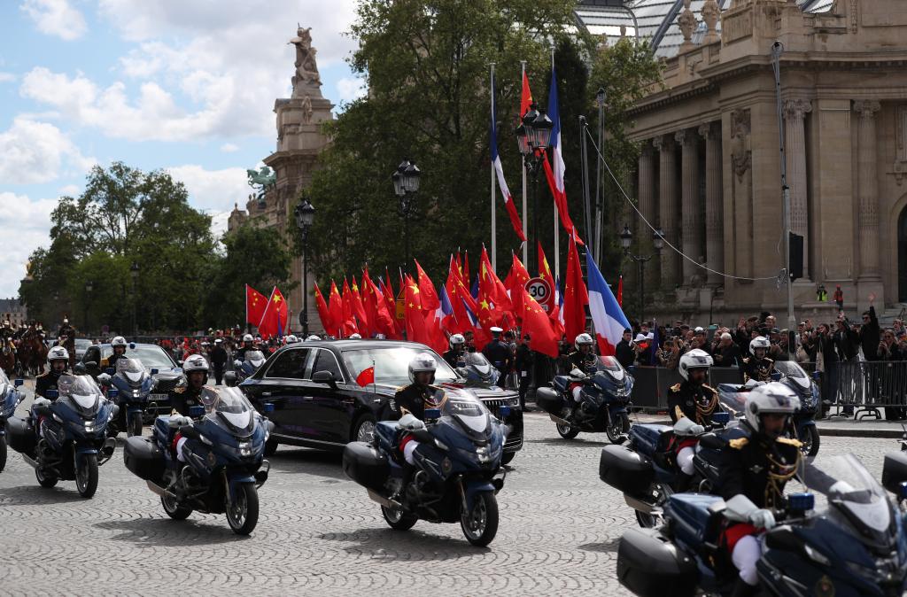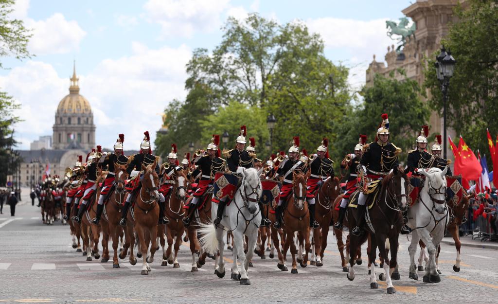 ??歡迎儀式后,習(xí)近平和夫人彭麗媛在共和國衛(wèi)隊148名騎兵組成的禮兵馬隊和摩托車隊護衛(wèi)下,乘車前往愛麗舍宮。