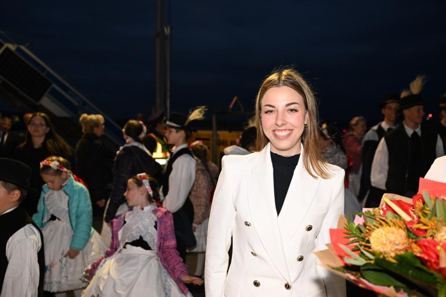 ??當(dāng)?shù)貢r(shí)間5月8日晚,在匈牙利布達(dá)佩斯國際機(jī)場(chǎng)歡迎隊(duì)伍中的匈牙利姑娘歐拉·塔瑪拉。新華社記者 謝環(huán)馳 攝