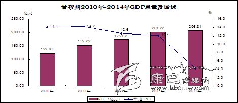 2014年,全州地區(qū)生產(chǎn)總值(GDP)達到206.81億元,按可比價格計算較2013年增長4.2%。其中,第一產(chǎn)業(yè)增加值51.48億元,增長4.6%;第二產(chǎn)業(yè)增加值77.20億元,增長2.4%;第三產(chǎn)業(yè)增加值78.13億元,增長6%。三次產(chǎn)業(yè)結(jié)構(gòu)為24.9:37.3:37.8。