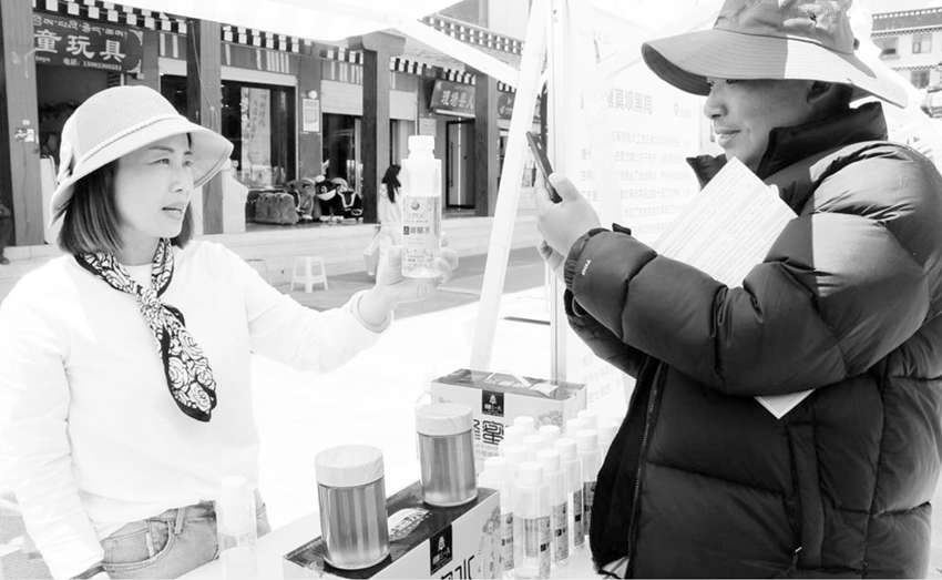 圖為公司在縣城廣場推銷蜂蜜水。