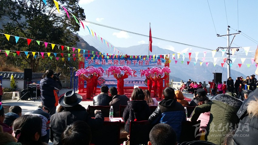 鼓聲喧天、歌聲飛揚(yáng),現(xiàn)場(chǎng)到處洋溢著濃濃的節(jié)日氛圍。浩浩蕩蕩的隊(duì)伍也引來(lái)了不少村民和游客們的關(guān)注。特別是隊(duì)伍中幾個(gè)唱山歌的村民獨(dú)特的腔調(diào)和唱詞盡展和平村山歌的特色。和平村每到冬月以后,村民家家戶戶便開(kāi)始?xì)⒛曦i,相互串門,吃年豬宴,這一習(xí)俗已傳承百年,在和平村村民的心中,年豬文化節(jié)是一個(gè)慶祝豐收的節(jié)日。上午十點(diǎn)半,游行隊(duì)伍來(lái)到了和平村村級(jí)活動(dòng)室,“豬王”被放在了舞臺(tái)中間,焚香祈福后,當(dāng)?shù)卮迕裼幂d歌載舞的方式共慶這一節(jié)日的成功舉辦。村民們自編自演的舞蹈《祖國(guó)您好》《喜慶臨門》《紅梅贊》,現(xiàn)場(chǎng)表演唱山歌打草鞋,每一支舞,每一首歌都傳遞著村民們對(duì)黨對(duì)祖國(guó)對(duì)新生活的無(wú)限熱愛(ài)。