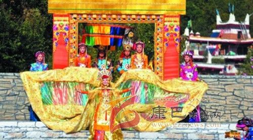 在催人奮進(jìn)的戰(zhàn)鼓聲中,一群身披甲胄的士兵拿著長劍,背著巨弓走到臺(tái)前,在鏗鏘的戰(zhàn)鼓聲中,戰(zhàn)士們做著各種競技動(dòng)作,模仿武士們互相攻擊的樣子,那矯健的身影展示了遠(yuǎn)古時(shí)代嘉絨藏族先民們?yōu)榱松媾c自然努力抗?fàn)幍膱?chǎng)景。過了一會(huì)兒音樂一轉(zhuǎn),戰(zhàn)鼓聲漸漸減弱,在鳥雀的陣陣啾啾聲中,一座木門慢慢的開啟,一位身披長袍、頭戴鳳冠的女王在眾多美女的簇?fù)硐?,緩緩走下臺(tái)階步入舞臺(tái)中央,此時(shí),一位手捧托盤的老者來到女王面前單膝下跪,將托盤高舉過頂,并邀請(qǐng)女王品嘗佳肴,女王將中指在酒中蘸了蘸,并曲起中指向四周輕輕彈去,寓意愿將杯中美酒與四方百姓同飲。在女王面前還放置著一個(gè)凈水桶,桶中盛滿了清澈的甘泉,桶上橫放著一枝柏樹枝,女王伸出纖纖玉手,拿著柏樹枝在水中蘸了蘸,面向墨爾多神山撒去,寓意向神山祈福。這是此次《美人谷·丹巴》節(jié)目展演中的序曲部分,有著強(qiáng)烈的東女神韻,將遠(yuǎn)古時(shí)代東女國女王遺風(fēng)展演的淋漓盡致。