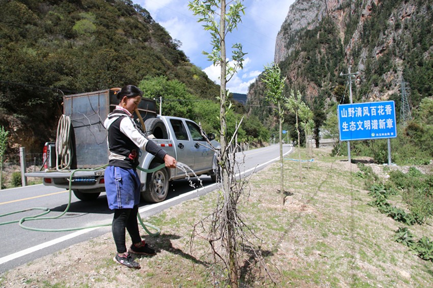 植樹容易,保持存活率很難。“植樹植樹,一分栽九分管。我們植樹造林不只看數(shù)量,更注重質(zhì)量,注重栽植方法和科學的后期養(yǎng)護管理,保證樹木的成活率?!?/span>6月11日,在白玉縣絨蓋鄉(xiāng),長江造林局駐白玉管護站站長梁榮忙著進行現(xiàn)場管護技術(shù)指導,“把遮陽網(wǎng)裹緊點、把刺巴綁緊點,以免牛和馬啃皮子;水要澆透,不然水分不夠,樹子一斷水,再想‘返陽’就難了;護欄水泥樁要栽牢,不然牛馬一撞就倒了……”。