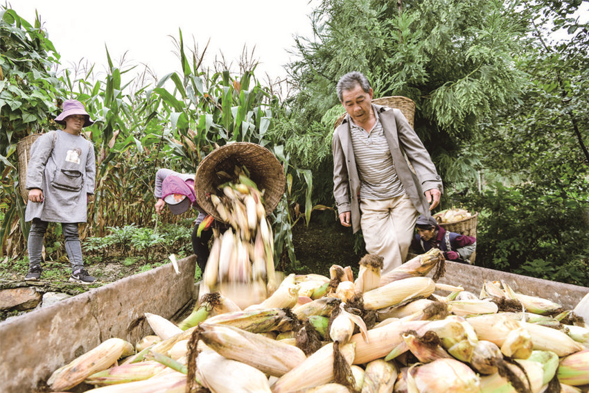 9月23日,依山而居的南門關村二組村民們,一大早就聚集在了高孟明家門口?!案叽蟾纾裉觳幌掠?,我們趁早去掰你家的玉米吧。”短短二十分鐘,二十多名鄉(xiāng)親就沿著鄉(xiāng)間小道,從村子里到達山坡上的玉米地,拖拉機的轟鳴將山村徹底喚醒,熱鬧的秋收就此開始……