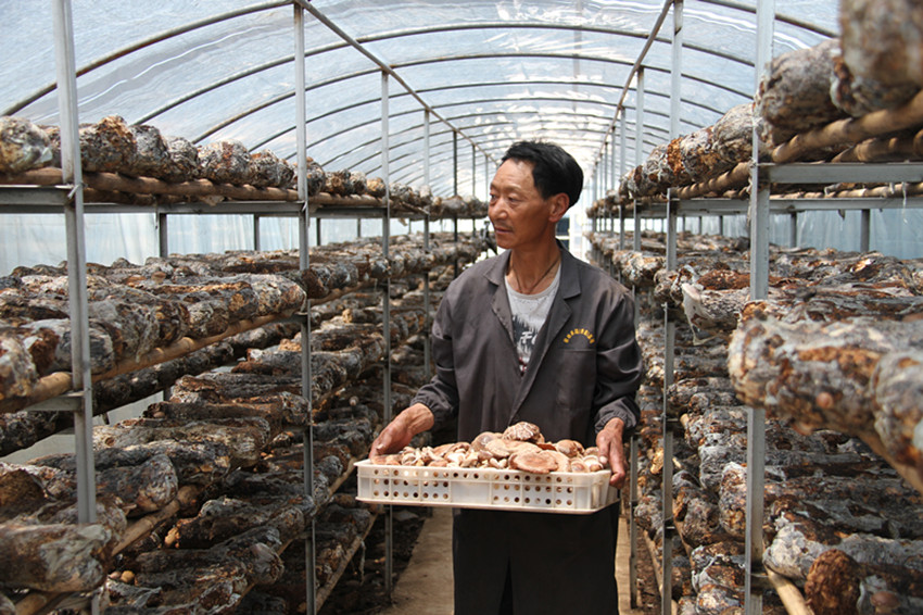 圖為當(dāng)?shù)貏?wù)工人員正在采摘香菇。