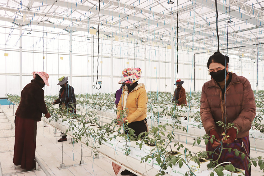 理塘縣甲洼鎮(zhèn)瑪吉阿米花園農莊智慧農業(yè)無土栽培館內,工人正忙著給番茄苗綁蔓、整枝、打杈等。