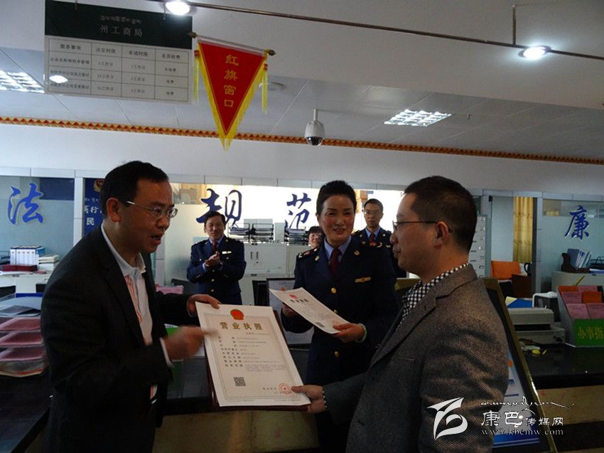 本網(wǎng)訊(郭梅/文 鄧安宇/圖 ) “我在綿陽(yáng)市做生意,甘孜州提出打造‘圣潔甘孜’品牌時(shí),我就醞釀注冊(cè)一家電商公司,在新聞上看到甘孜州要實(shí)行‘先照后證’,我第一時(shí)間趕過(guò)來(lái),不到15分鐘就拿到了營(yíng)業(yè)執(zhí)照!”10月8日上午,我州“先照后證”試點(diǎn)工作在康定縣啟動(dòng)后,州政府政務(wù)大廳工商窗口把“先照后證”第一份營(yíng)業(yè)執(zhí)照頒發(fā)給了敬開(kāi)春,登記窗口書(shū)面告知他,隨后將在康定縣食藥局辦理食品流通許可證。