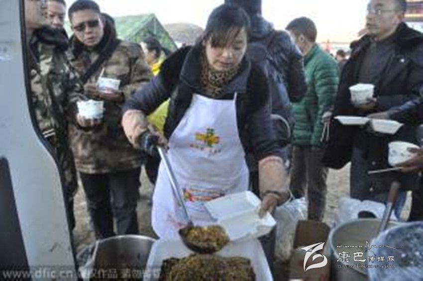 據了解,韓大哥是這家飯店的老板之一,他是仁壽縣人,幾年前和朋友來到新都橋開始經營飯店??刀?.3級地震發(fā)生時,他人在成都。但看到災情發(fā)生,韓大哥立即和飯店另外幾個合伙人決定到安置點免費送盒飯,“我在當地做了6、7年生意,現在出了事情,就應該伸手支援嘛!”據韓大哥介紹,此次地震發(fā)生后,新都橋80%左右的飯店都已經關門,他們的飯店因為還有一些接待工作,仍在正常營業(yè)。自11月23日晚上,他家的飯店就主動為塔公鎮(zhèn)的安置點免費派送盒飯,“包括中午和晚上兩頓,兩葷兩素一湯的配置。”因為太忙, 韓大哥來不及仔細統計,他大概知道每天送出的盒飯在1200盒到1500盒之間,每天送出盒飯的成本在4、5千左右。但在他看來,這些其實都算不上什么,“能為災區(qū)出一份力,我們就很滿足了,我們打算一直送到抗震救災工作結束,也就是直到災民有條件自己做飯的時候。”“這邊天氣很冷,他們吃的一般是些面包、牛奶之類的干糧,我們就是想讓大家吃到熱飯、熱菜。”據韓大哥介紹,每天飯店都會派出3、4個人將盒飯運送到安置點,“只要有人需要我們都會分發(fā)盒飯,包括一些志愿者和武警官兵也吃我們的飯。