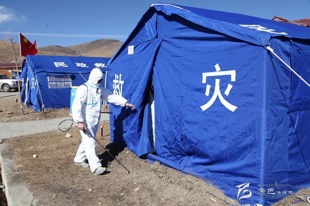 在離武警武警四川總隊(duì)二支隊(duì)的醫(yī)務(wù)站不遠(yuǎn)的地方,新都橋中心衛(wèi)生院的衛(wèi)生員羅衛(wèi)強(qiáng)正“全副武裝”的為每一頂帳篷做著消毒。羅衛(wèi)強(qiáng)說:“我們從地震第一天到現(xiàn)在一直堅(jiān)守在一線,22日到26日都在祖慶小學(xué)進(jìn)行消毒工作,27日和其他工作人員換班到了江巴牧民新村安置點(diǎn)。我們每天會(huì)早上一次,晚上一次對(duì)每一間帳篷進(jìn)行兩次消毒。除了我們,康定縣疾控中心的工作人員還會(huì)每天進(jìn)行一次消毒,我們都在盡最大的努力保證牧民生活環(huán)境的衛(wèi)生。”在對(duì)環(huán)境進(jìn)行消毒后,他又來到醫(yī)療就助點(diǎn)為前來就醫(yī)的甲瑪它看起病來。