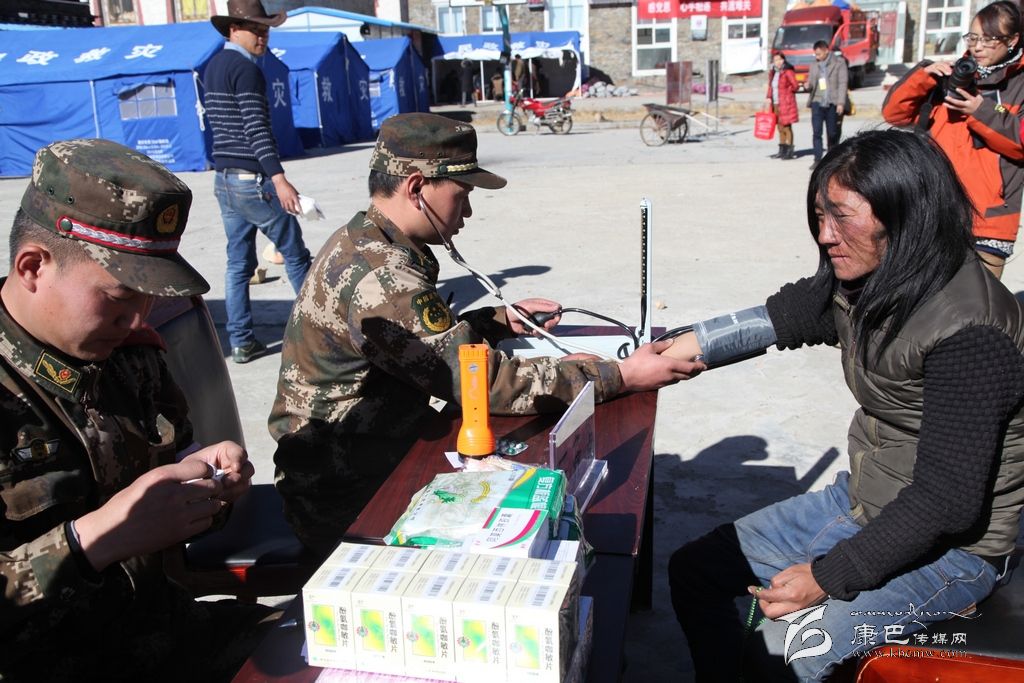 “醫(yī)生,麻煩你給我一點(diǎn)拉肚子的藥,我肚子有點(diǎn)痛!”在江巴村活動(dòng)室外的壩子里,記者看到一位牧民來到武警四川總隊(duì)二支隊(duì)的義診就醫(yī)點(diǎn)取藥,幾位軍醫(yī)正在為農(nóng)牧民看病、測(cè)血壓……軍醫(yī)陳海波告訴記者說:“震后病菌很容易滋生感冒、腹瀉等流行疾病,地震后的第二天我們就來到這里,每天都為這里的農(nóng)牧民義務(wù)看病就診,最多的時(shí)候每天有近50人來看病,今天我們就為47人進(jìn)行了義診,里面有一兩個(gè)人出現(xiàn)了感冒和腹瀉的狀況。還有一些病人血壓有點(diǎn)高,我們都給他們開了藥,并對(duì)他們進(jìn)行了叮囑,要求他們每天都進(jìn)行復(fù)查。”
