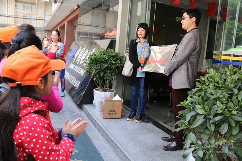 甘孜小記者活動負責人向電信甘孜分公司市場部總經(jīng)理何宇檳頒發(fā)甘孜小記者實訓基地牌。