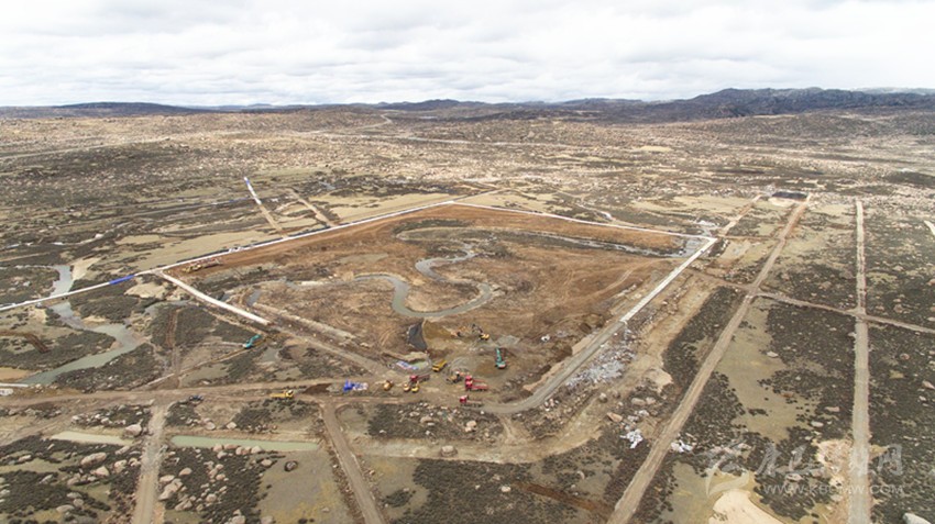 在海子山散落著數(shù)米寬巨石的曠野上,一塊有10個足球場大的圓形區(qū)域已經(jīng)成型,挖土機(jī)忙著挖出3個“品”字形、深4.5米的巨型水池。