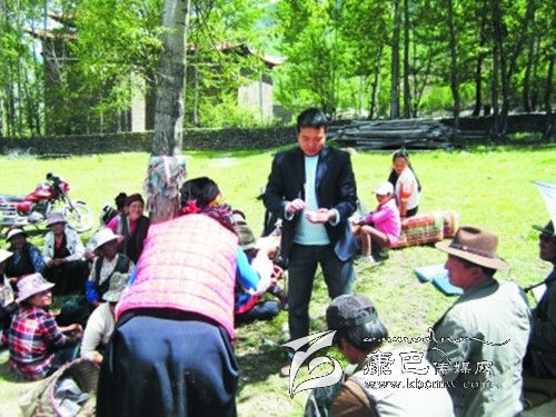 康定縣農村信用合作社職工下鄉(xiāng)宣傳信貸政策,并對村民進行評級授信,發(fā)放小額農戶信用貸款證。